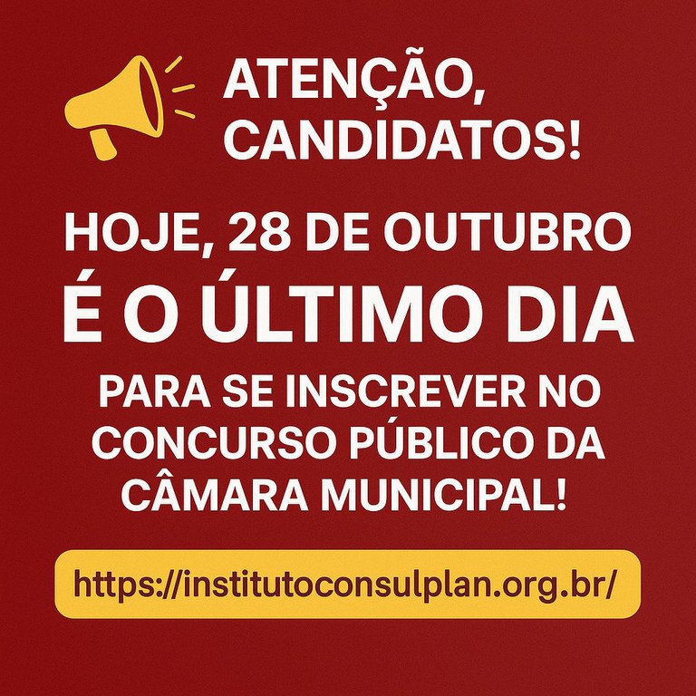 A Câmara Municipal de Piraquara informa que encerram-se hoje, dia 28 de outubro de 2025, às 16h, as inscrições para o Concurso Público destinado ao provimento de cargos efetivos do quadro de servidores da Casa Legislativa.